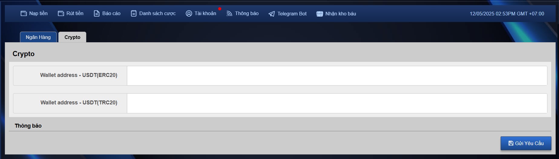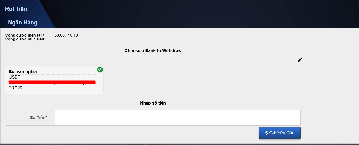 Điền thông tin tài khoản ngân hàng của bạn theo yêu cầu trong bảng, sau đó ấn "Gửi Yêu Cầu".