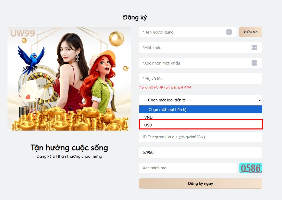 Bước 3: Sau khi điền xong thông tin thì chọn "Đăng ký ngay". Hoàn thành việc đăng ký tài khoản UW99.