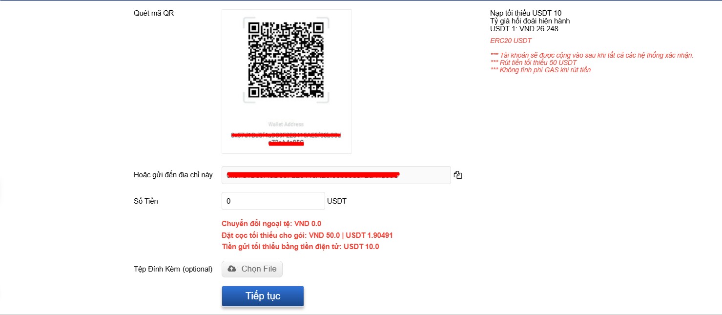 Lưu ý: Số tiền nạp tối thiểu là 10 USDT.