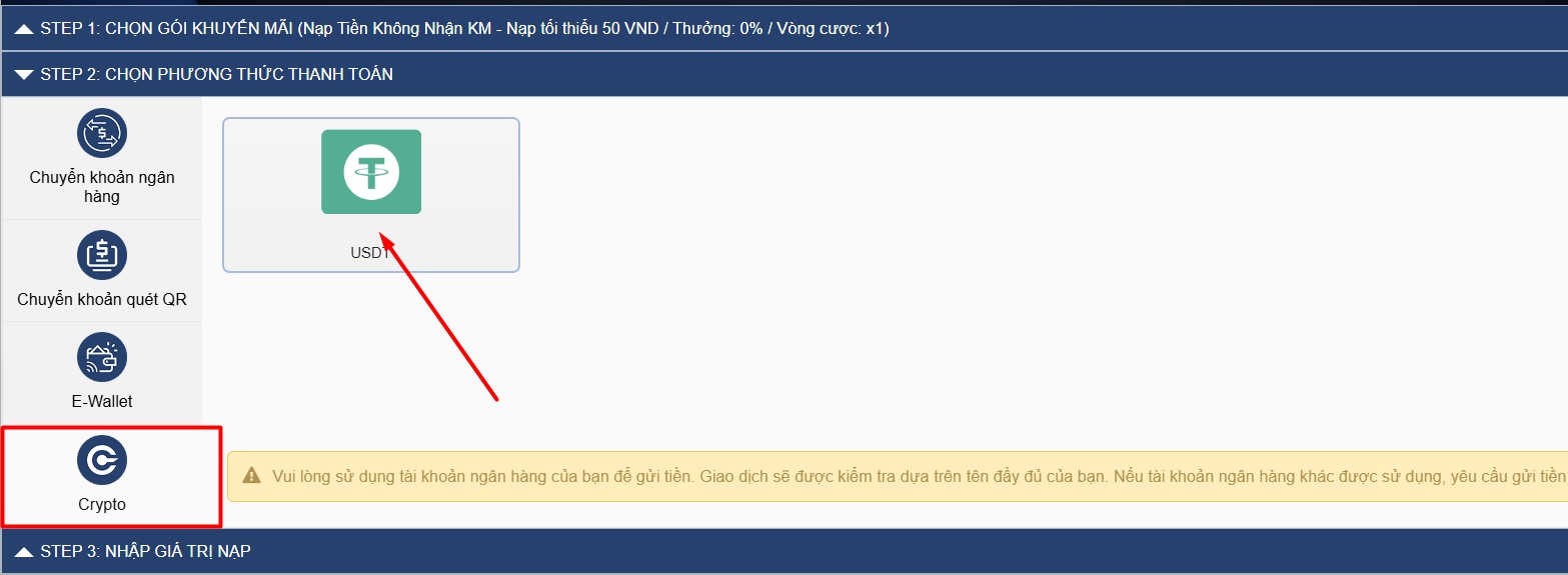 • Chọn "Crypto". Sau đó chọn "USDT" như hướng dẫn mũi tên trong ảnh dưới.